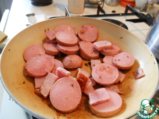 Пока суп томиться - очистим от кожицы сардельки и обжарим их в масле. У меня еще была копченая свиная шейка (где-то 100 грамм). При жарке я добавила слегка растолченные семяна тмина (1 ч. л.) и черный перец прямо горошинами (штук 7-10), чтобы лучше проявился их аромат.