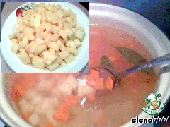 Картофель очистить и порезать кубиками, высыпать в кастрюльку с морковкой, положить лавровый лист.