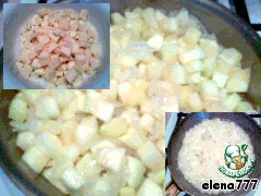 Теперь в суп спускаем тушёные овощи - лук и кабачки.