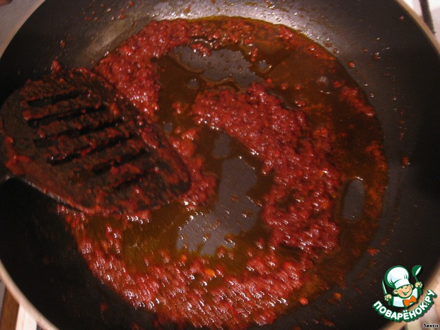 На сковородке разогреваем оливковое масло, добавляем 3 ложки томатной пасты, порошковый тмин и немного красного перца - обжариваем.