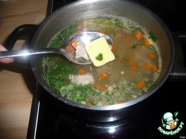 ...и кусочек сливочного масла. Не судите строго фотографию, в первый раз маслице наше с ложки "сплыло", пришлось ловить-вылавливать :)