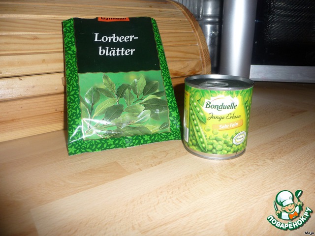 Когда овощи будут готовы, добавить зеленый горошек и парочку лавровых листков.Немного поварить.