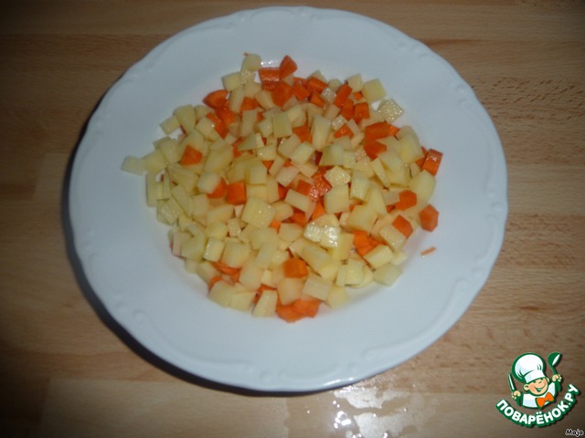 Морковь и картошку нарезать небольшими кубиками и положить в суп.