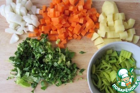 Наши продукты для супа. В оригинале для супа нужны семена любистка, у меня таковых не нашлось, их я заменила семенами тмина и свежей зеленью сельдерея, совсем чуть-чуть.