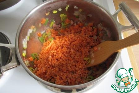 Всыпаем чечевицу, интенсивно перемешиваем минуты 3.