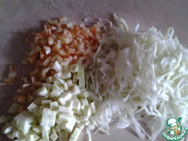 Пока помидоры кипят, нарезать овощи. Я люблю мелко. Можно добавить любые овощи. Но я расчёт калорий делала из указанных продуктов.