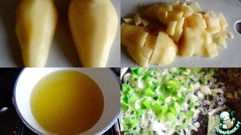 Для начала мы очистим грушу, освободим её от сердцевины и нарежем кубиками. Лук-порей разрежем вдоль, хорошо помоем под проточной водой и мелко порежем.
