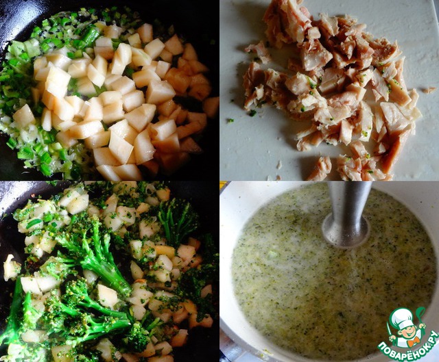 Заливаем их кипящим бульоном и держим на огне 2-3 мин. Вытаскиваем самые красивые соцветия брокколи, а остальное измельчаем ручным блендером.