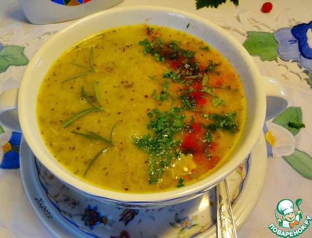 Минут через пять можно подавать Для этого петрушку нужно мелко порубить и украсить суп. Посыпать сверху щепоткой молотой паприки. И положить для украшения и аромата веточки свежего розмарина.