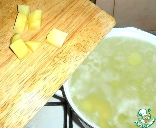 Пока варится картофель, необходимо сделать поджарку для нашего супчика - добавить масло на разогретую сковородку, порезанный кубиками лучок и морковь и пассеровать до золотистого цвета.