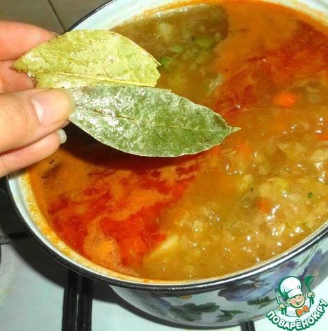 Следом отправляем к ним соль, черный перчик по вкусу, 2 лавровых листика. И оставляем наш супчик томиться на 10 мин. Снимаем пенку.