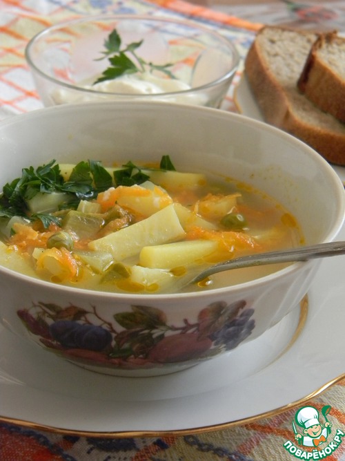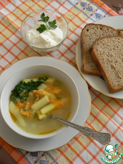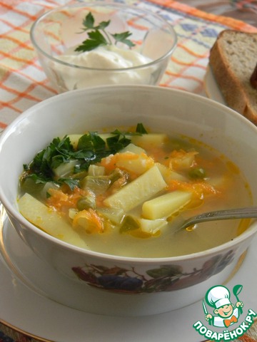 | Овощной суп с зеленым горошком и сербской брынзой. |
