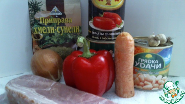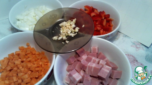 Лук и морковь мелко нарезать, чеснок измельчить, перец нарезать квадратиками, бекон - кубиками