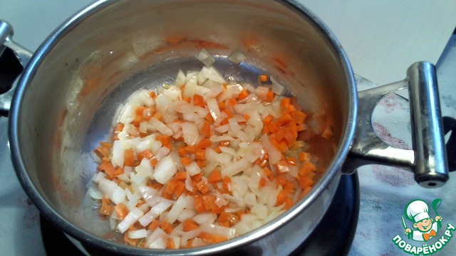 Лук и морковь выложить в толстостенную кастрюлю и спассеровать в растительном масле на небольшом огне до мягкости, 7-10 мин.