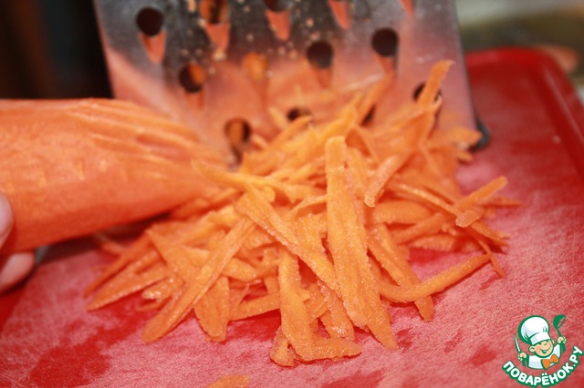 Морковь вымыть, очистить и натереть на крупной терке. Добавит к луку с чесноком.