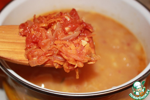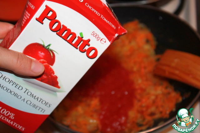Положить помидоры в собственном соку и тушить вместе с морковью и луком 7 минут. Можно добавить по 1 чайной ложке молотой паприки и тмина.