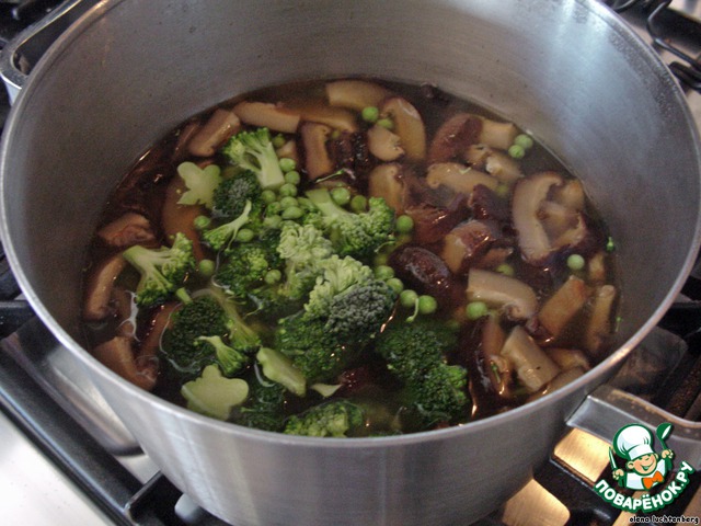Шиитаке замочить в горячей воде на 15 минут, шляпки нарезать полосочками, ножки выбросить (или сохранить для грибного бульона). Броколли измельчить, рыбу нарезать кусочками.