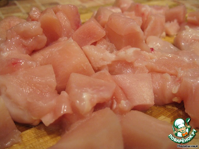 Куриное мясо моем и режем большими кубиками.