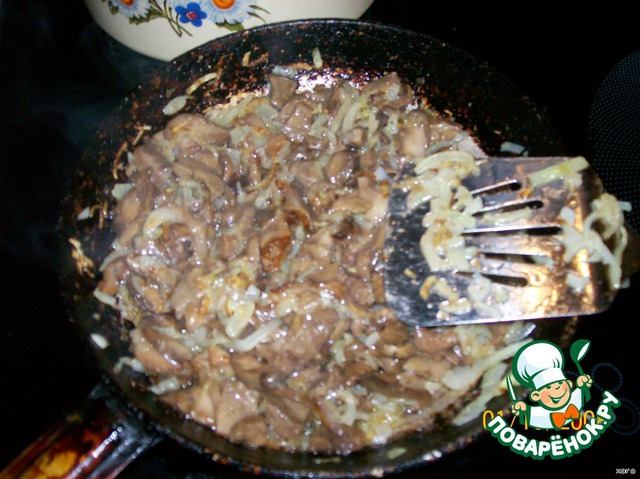 Луковицу мелко порезать, грибы - довольно крупно. Сначала обжарить лук на растительном масле до золотистого цвета, затем добавить грибы и сливочное масло.