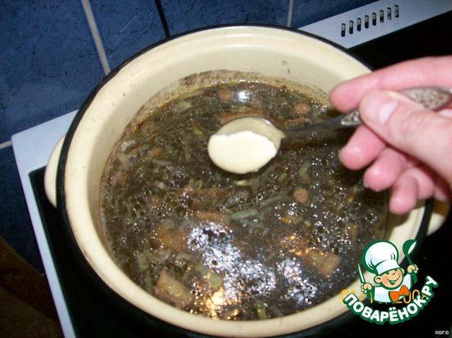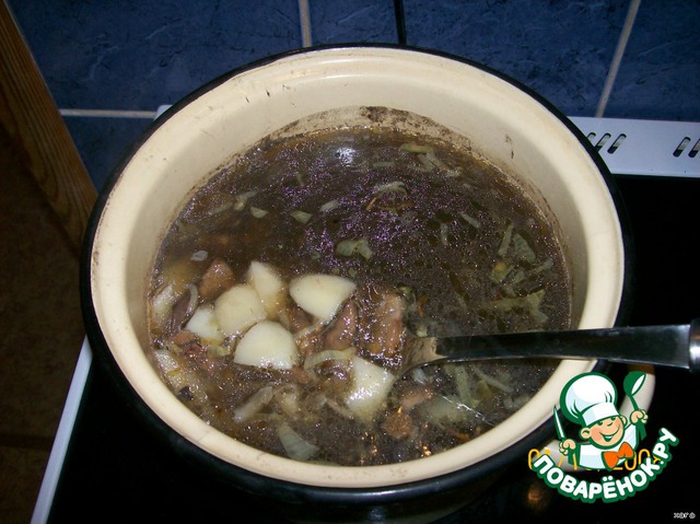 В кастрюлю налить 1,5 литра грибного бульона (только не из кубиков - они испортят вкус натуральных грибов), или воды, бросить нарезанный картофель и варить до готовности картофеля.