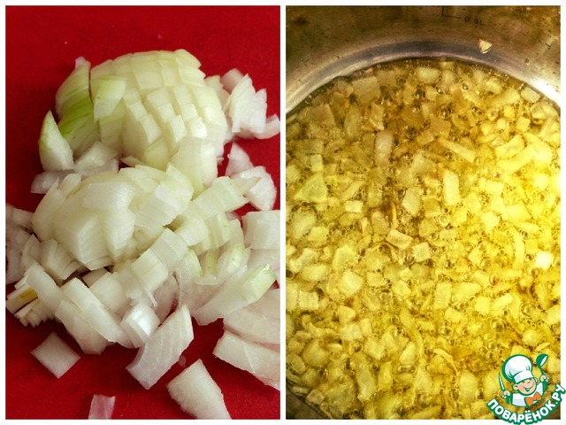 Сразу в кастрюльке в которой будет вариться суп, обжариваем лук в оливковом масле, до золотистого цвета.