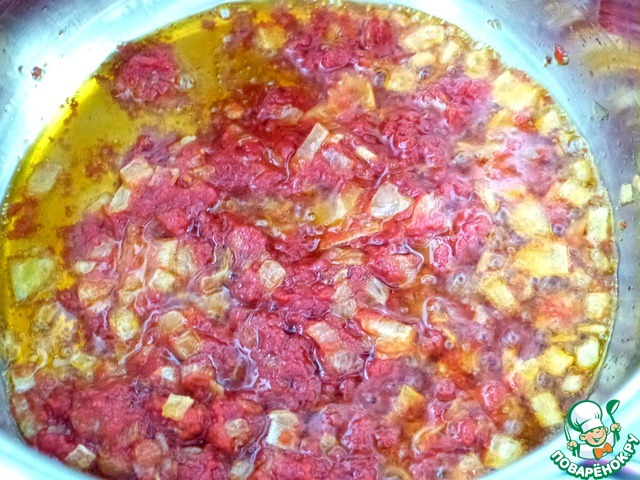 Лук стал приятного цвета, добавляем томатную пасту и слегка обжариваем – пол минуты, при необходимости доливаем немного воды.