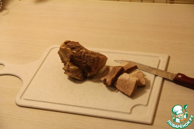 Лапша почти готова, время вылавливать мясо из бульона. Даем ему немножко остыть и режем на ломтики. Бульон тоже можно снять с огня