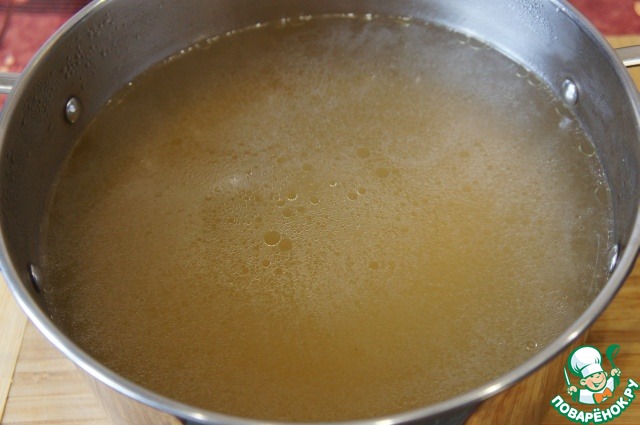 Сварить бульон (у меня были два куриных каркасика, мясо с которых я сняла для другого блюда) с добавлением овощей (лук, морковь, сельдерей корневой и черешковый) и специй (черный перец горошком, душистый перец, гвоздика).
