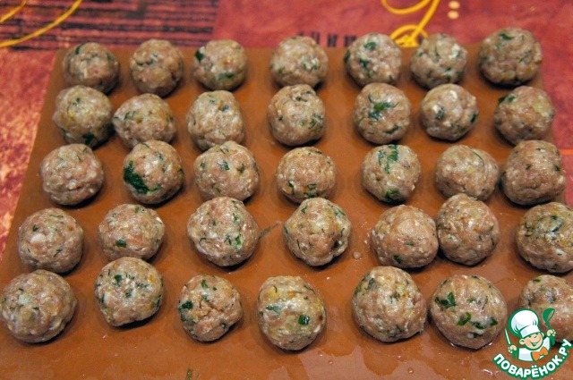 Фарш (можно взять и говяжий, и смешанный; у меня была телятина и немного филе куриной грудки) выложить в миску, добавить очень мелко нарезанную и обжаренную до золотистого цвета луковицу, специи, приправу и зелень, перемешать. Если фарш слишком густой, влить ложку-другую воды. Фарш вымесить и затем хорошо отбить. Я решила в этот раз обойтись без хлеба и без яйца. Скатать небольшие шарики, выложить их на доску и вынести на холод, чтобы окрепли.