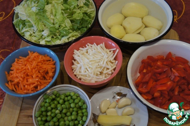 Морковь и сельдерей нашинковать соломкой, перец нарезать небольшими ромбиками, картофель - брусочками, у капусты вырезать грубые части листьев, оставшиеся кусочки нарезать вдоль на широкие полоски и затем поперек широкой лапшой. Имбирь натереть на терке, чеснок мелко нарубить ножом. Грибы отварить и нарезать кусочками (у меня была домашняя заготовка - замороженные вареные красноголовики).