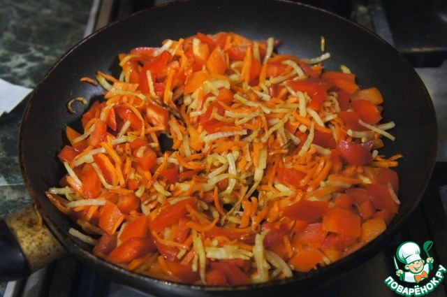 Морковь и сельдерей спассеровать на растительном масле до полуготовности, добавить перец и обжарить в течение 5 минут. Добавить томат-пасту и тушить еще несколько минут.