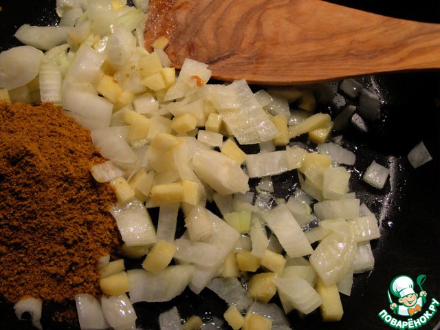 Лук и имбирь почистить и порезать. Разогреть сковороду и слегка потомить с растительным маслом, добавить карри.