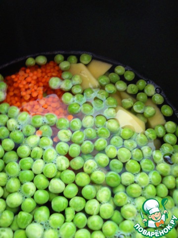 Картофель почистить и порезать на кусочки, положить в кастрюлю. Добавить зеленый горошек (можно прям замороженный), чечевицу и все залить горячим бульоном (водой).