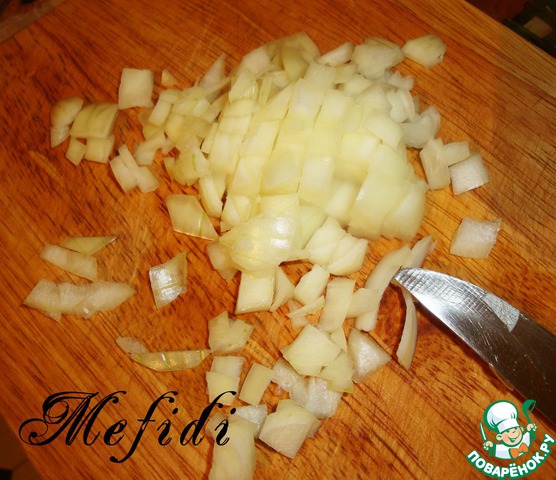 Нарезаем половину головки лука кубиками. Высыпаем в кипящую воду. Варим, пока вода не приобретет зеленоватый оттенок.