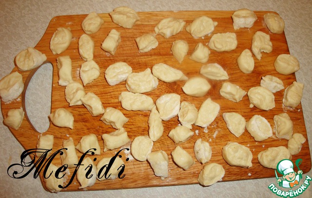 Нарезаем тесто. Сначало крутим колбаску, а потом уже на свой вкус определяем размер клёцек. Я делаю большие - ребенок так больше любит.