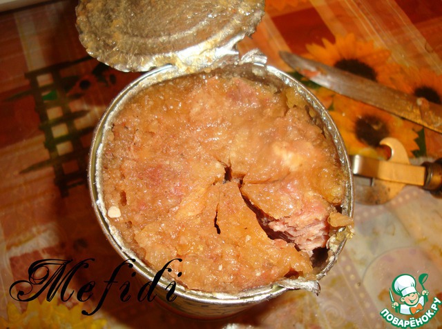 Открываем тушенку. Делим, как тортик, и высыпаем в кастрюлю. Варим еще минут 10.