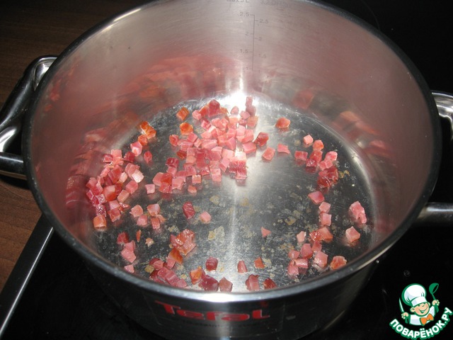 Сначала подготовим наши овощи: морковку, картошку почистить и порезать, черешковый сельдерей почистить и порезать, затем в ковшике пожарить бекон, не добавляя жира, но не зажаривать, выложить на бумажное полотенце.