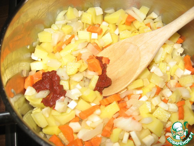 Затем к нашим овощам добавить томатную пасту и опять пару минут оставить тушиться.