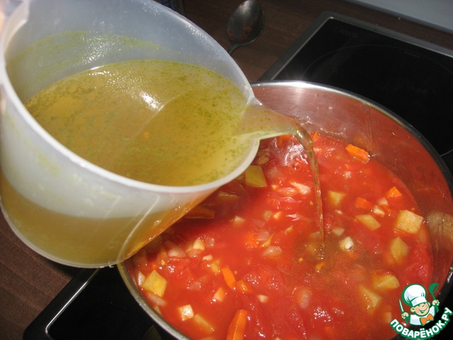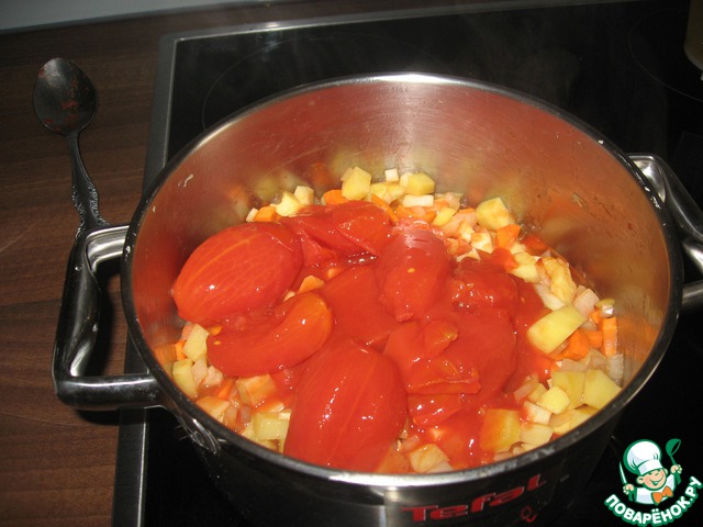 Добавить банку помидоров в собственном соку, немного размяв их.