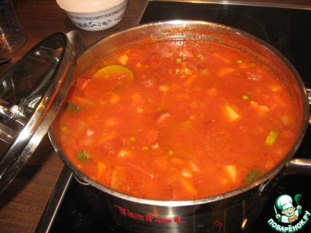 Порезать цуккини, добавить к супу и также добавить зеленый горошек и порезанные на кружочки сосиски, дать еще 5-10 минут покипеть.