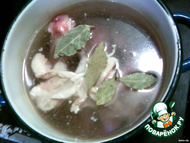 из косточек и шкурок, оставшихся от приготовления "Курочки в соусе с салями" варим бульон (добавляем черный перец горошком и лавровый лист)
