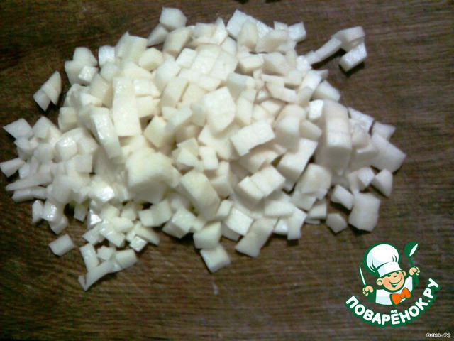 картошку режем мелкими кубиками, бросаем в кипящий бульон