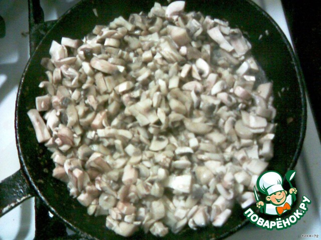 шампиньоны мелко режем, обжариваем в той же сковородке на 1 стол. л. раст. масла до готовности, отложить на тарелку
