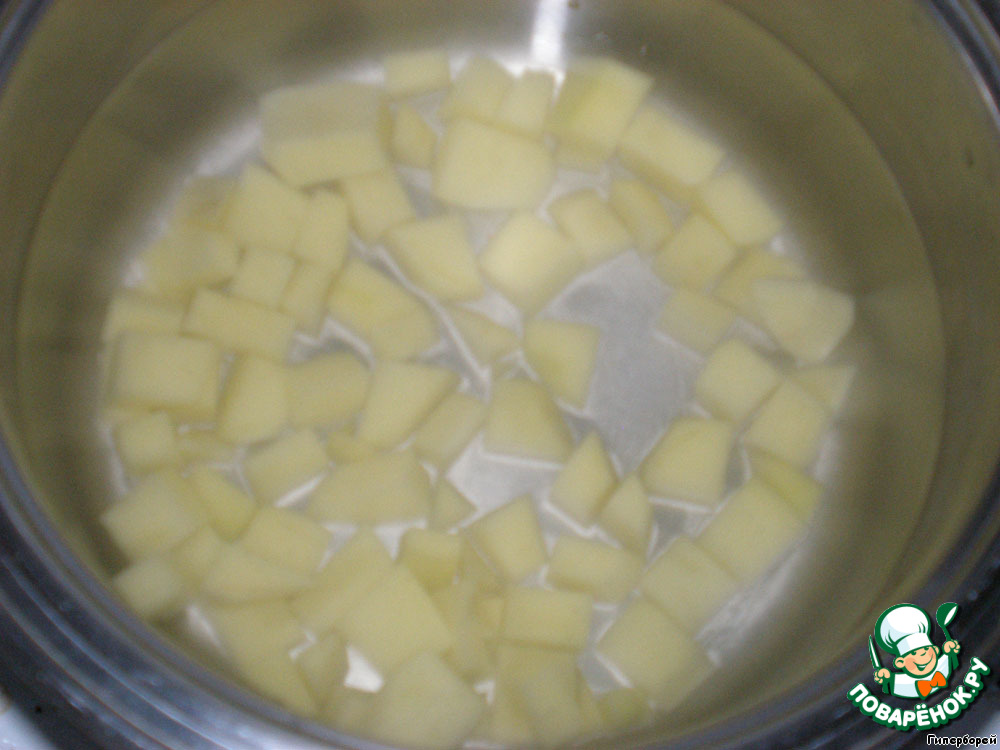 Картофель нарезать кубиками, залить водой и поставить варить.