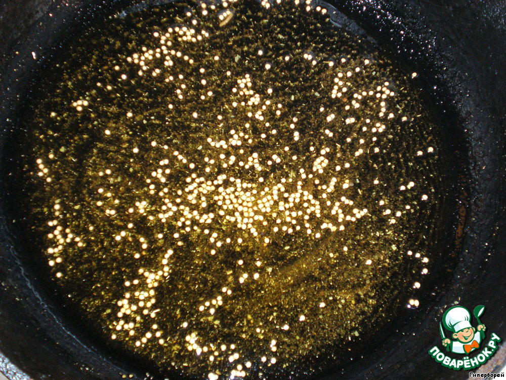 В разогретую сковороду всыпаем горчицу и хмели-сунели. Поджариваем до распространения аромата по кухне.