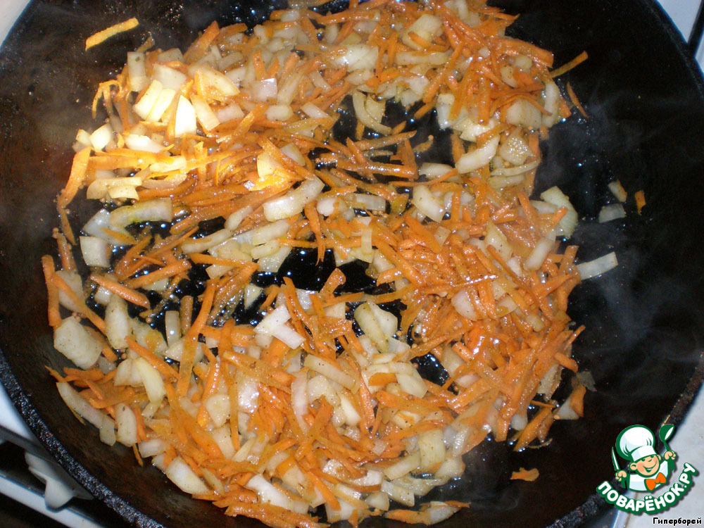 Добавляем нарезанный лук и натертую на крупной терке морковь, перемешиваем и продолжаем поджаривать.