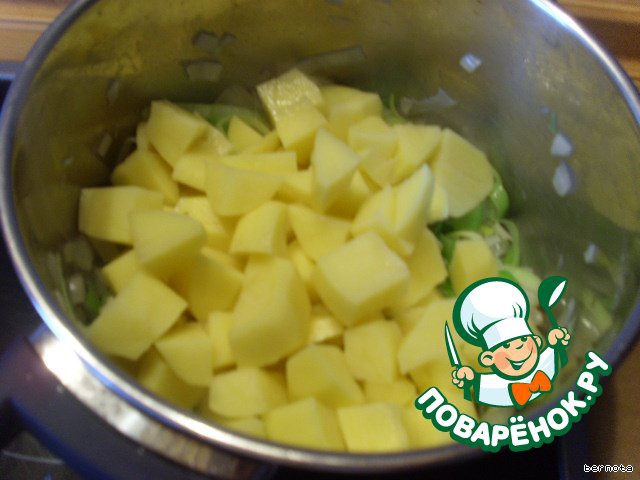 В кастрюлю наливаем масло, закладываем лук 1,5 головки и порей.