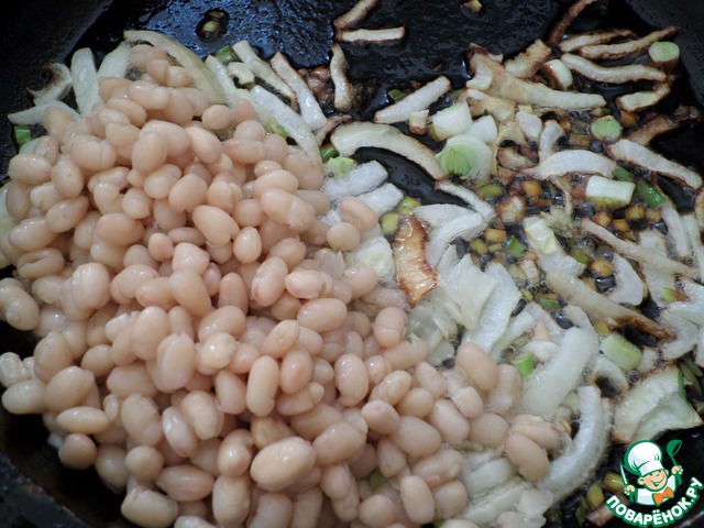 Репчатый лук очистим и нарежем полукольцами, обжарим в оливковом масле до золотистого цвета, добавим фасоль и немного спассеруем все вместе.