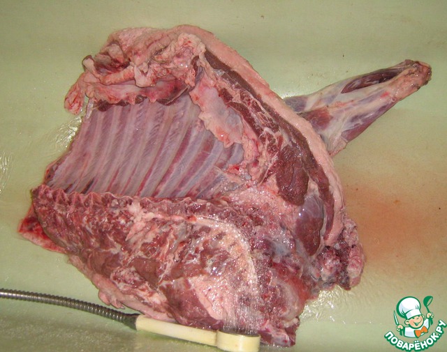 Мясо промываем и разделываем. Нам понадобится реберная часть.