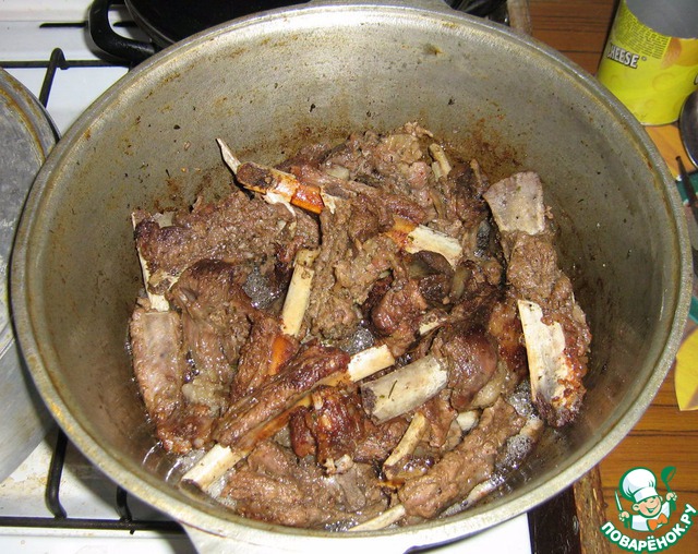 Срезаем кусочки жира, растапливаем в казане и закладываем ребра жариться
